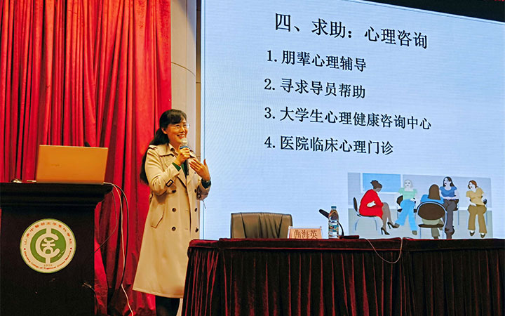 启动仪式后,滨州医学院应用心理学系主任曲海英教授作了题为《我爱我,用心用情》的讲座,从“后疫情时代”对学生产生的心理影响为切入点,通过互动体验的方式,引导大家正确认识负面情绪、识别心理问题,并提供了合理应对、具体可行的方法策略,让大家切身感受到了身心的放松和愉悦。